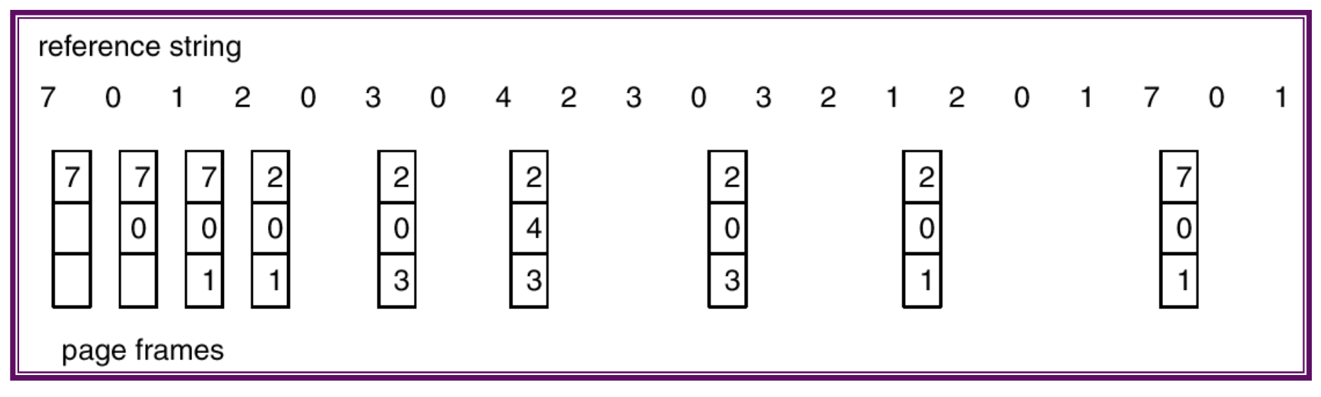 Page를 참조 할 때 마다 그 Page를 기록해두고, Replace 할 때 최근에 접근한 Page는 유지하고 제일 오래 전에 접근한 Page를 Swap Out 한다.