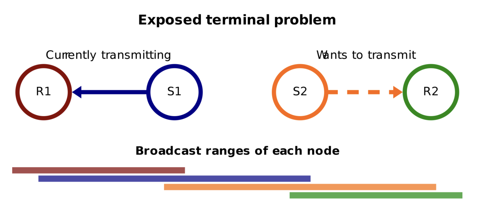 하지만 S2의 전송 대상인 R2는 S1의 전송 범위 밖에 있고, S2는 전송해도 S1과 충돌이 발생하지 않는 상황임에도 기다린다.