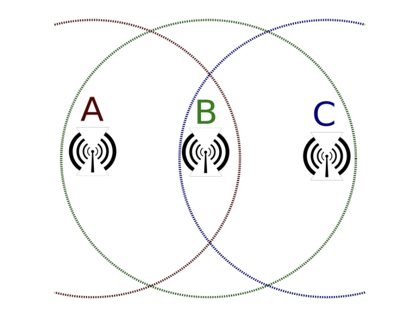 A와 B / B와 C는 서로 통신할 수 있지만 A와 C는 서로 통신할 수 없다.