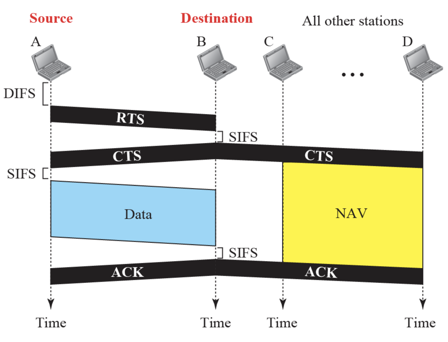 NAV (Network Allocation Vector) 는 무선 환경에서 충돌을 회피하기 위해 모든 장치에게 특정 시간동안 채널을 쓰겠다는 정보를 알려주는 매커니즘이다.