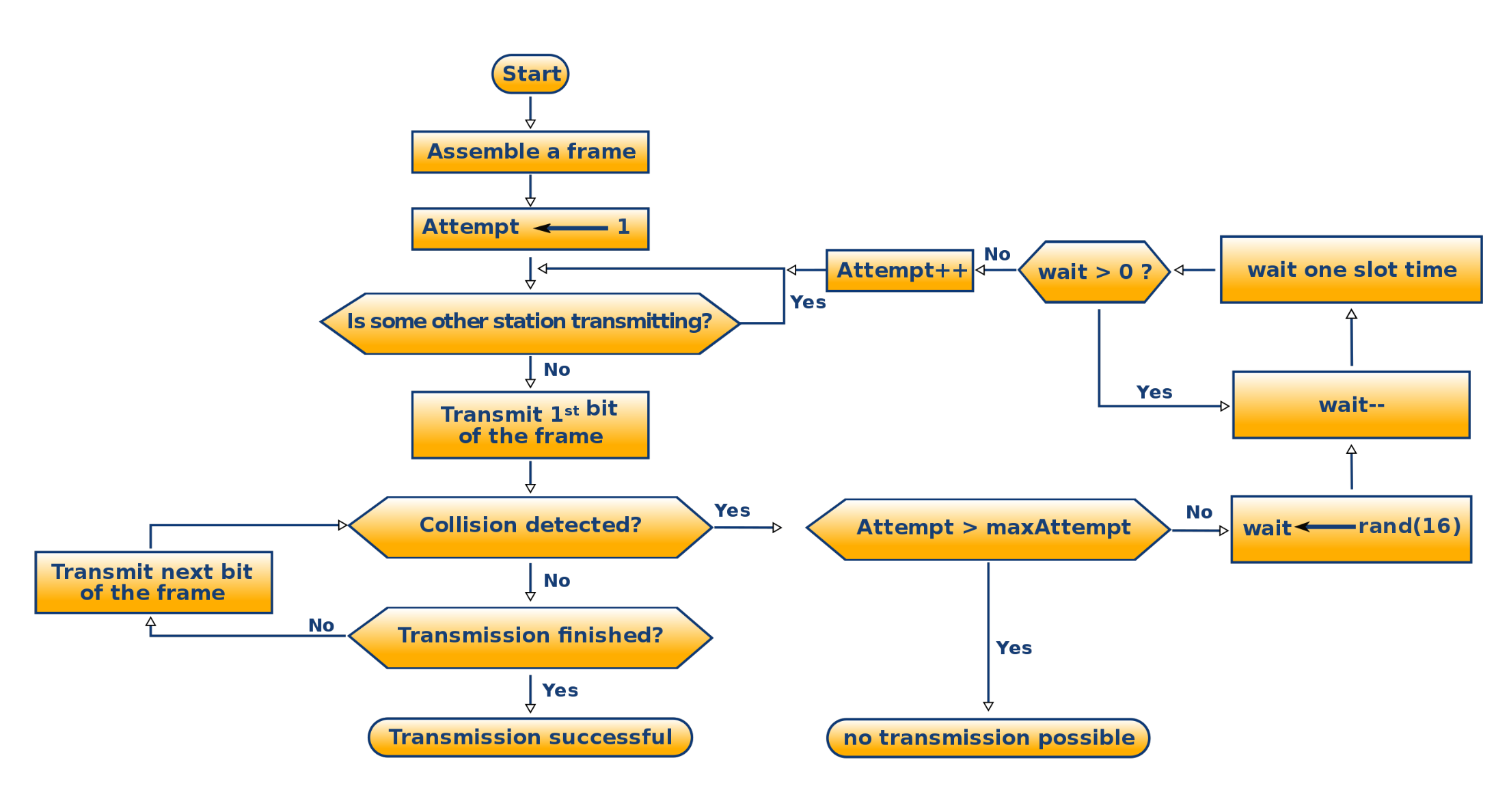 Ethernet의 핵심은 CSMA/CD (Carrier Sense Multiple Access with Collision Detection) 으로, 말 그대로 듣고 충돌나면 다시 하는 방식을 사용한다.