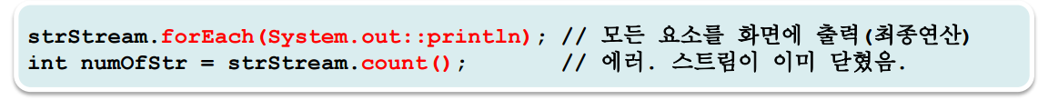 최종 연산까지 거친 스트림은 다시 사용할 수 없다. (Iterator와 비슷함)