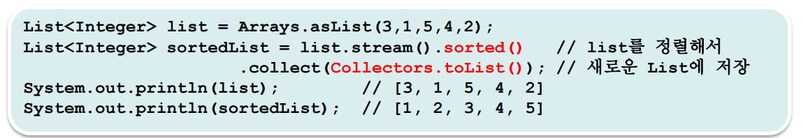 스트림을 통해 데이터를 조작하고 조작한 데이터를 새로운 컬렉션에 저장할 수는 있지만, 변경할 수는 없다.