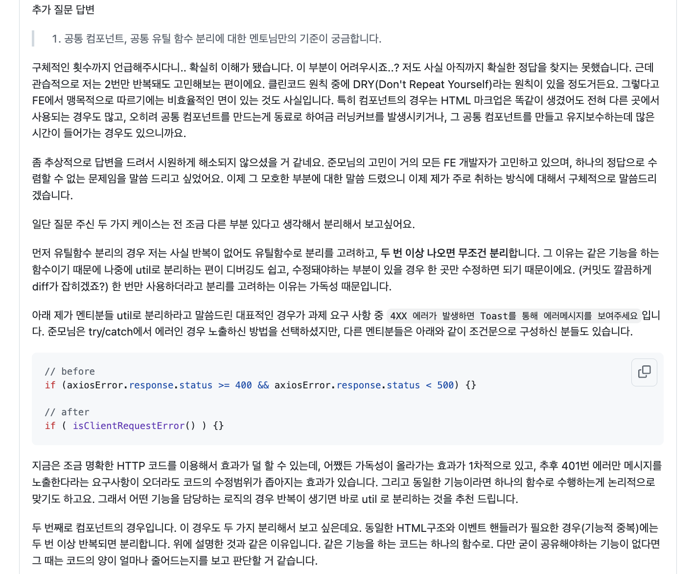 답이 정해져있지 않은 문제들에 대해 멘토님에게 많이 물어보고 있고, 물어볼 때 마다 정말 자세하게 답변해주신다.