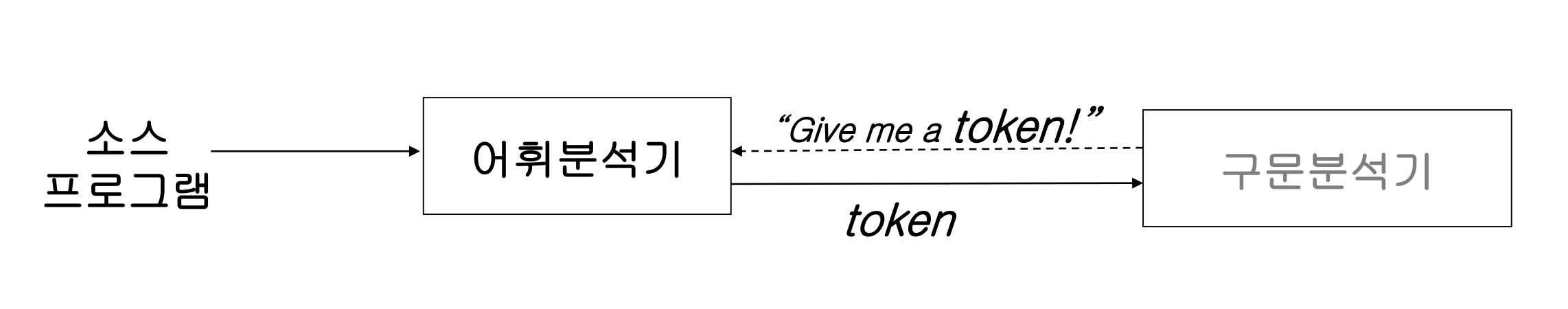 구문분석기는 프로그램의 구조를 분석하기 위해 어휘분석기에게 다음 토큰을 요구하고, 어휘분석기는 프로그램을 읽다가 규칙에 맞는 lexeme을 찾고 토큰으로 변환해 구문분석기에게 전달한다.