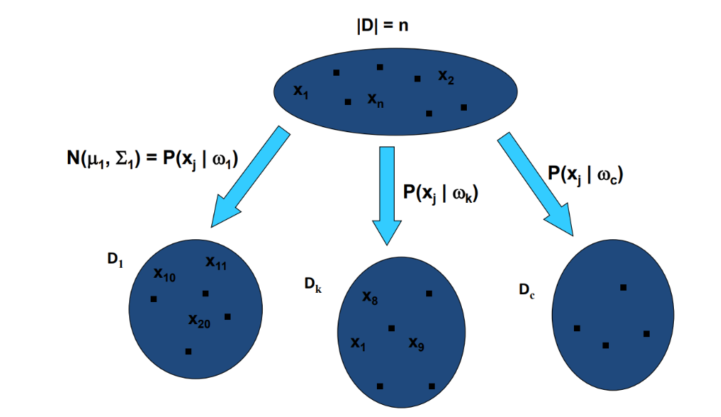데이터셋 D를 클래스별로 나누고 각 클래스 데이터셋을 기반으로 MLE를 사용해 가우시안 분포를 추정한다.