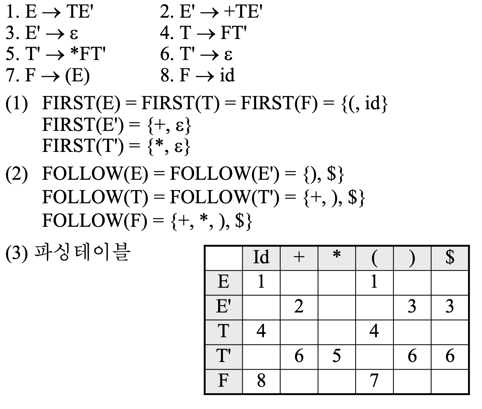 (3)\; E \to T E' \;\;\text{에서 } E' \Rightarrow^* \varepsilon \;\;\Rightarrow\;\;