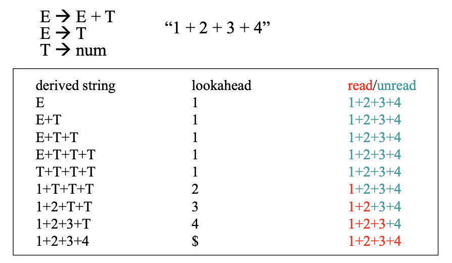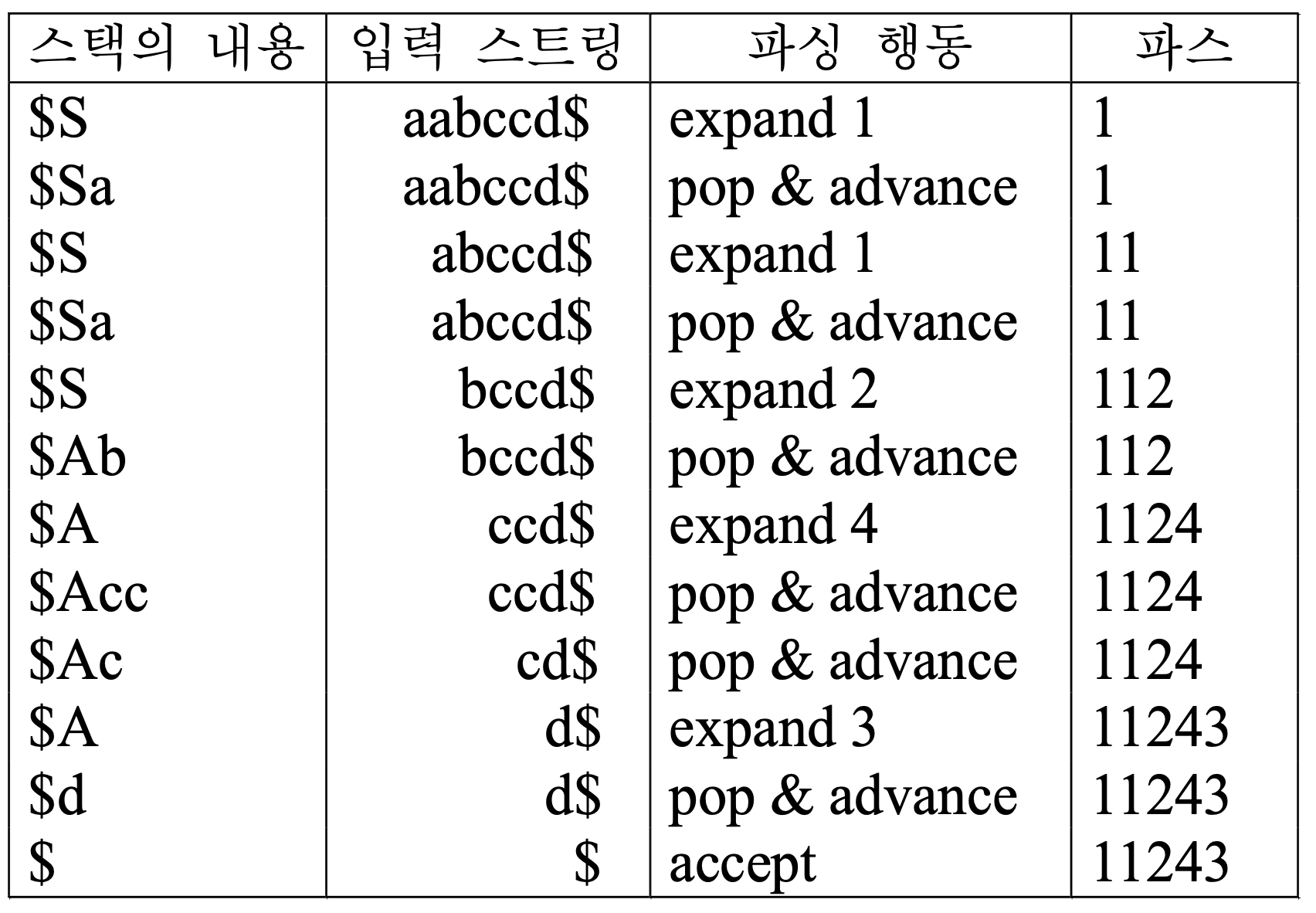 즉 애초에 LL으로 가능한 문법만 처리할 수 있고, 입력 문자에 대해 적용할 생성 규칙을 미리 뽑아 두고 시작해야 하는데