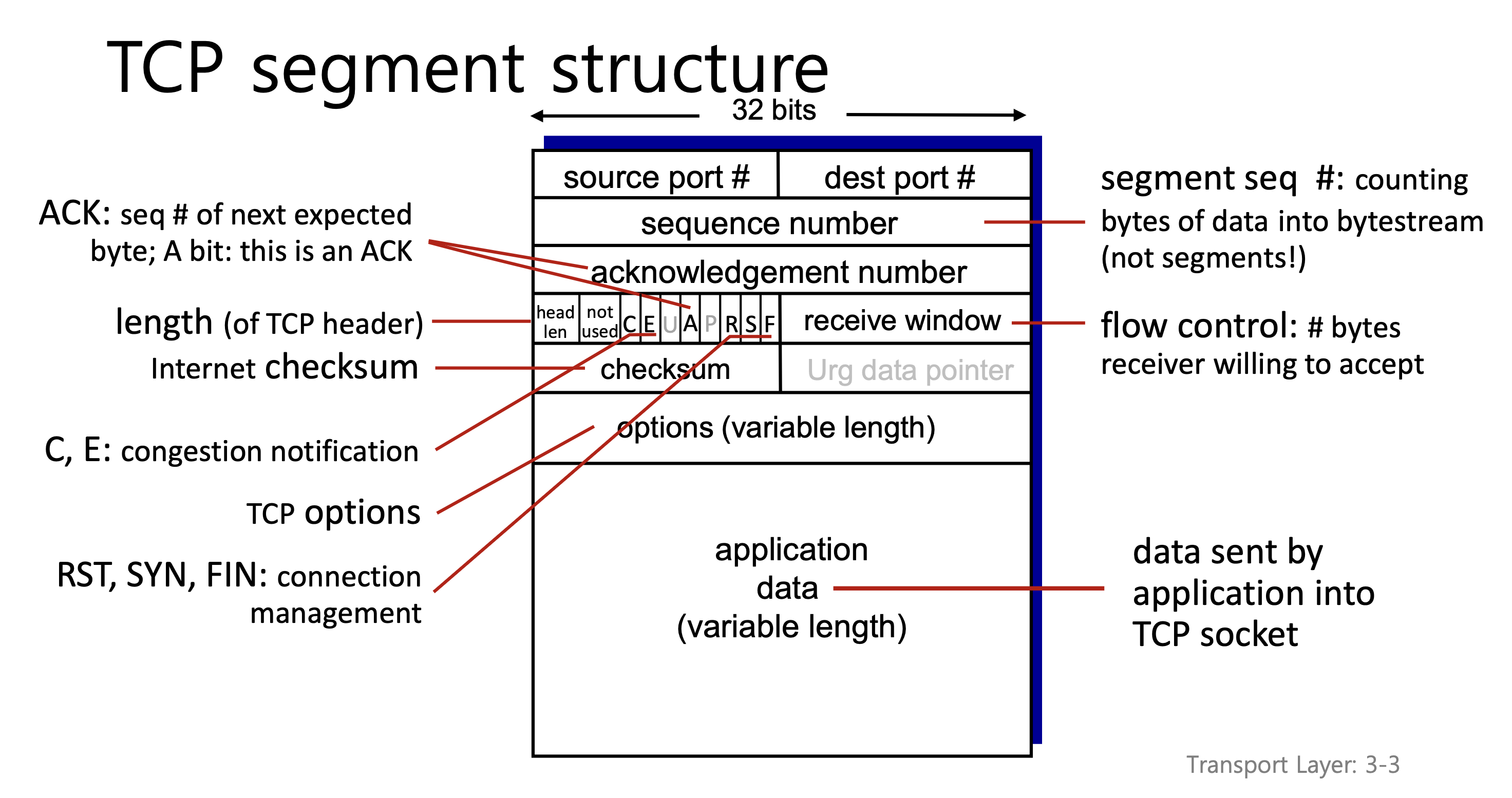 ACK - 수신자가 송신자에게 다음에 받고 싶은 바이트 번호를 알려준다. 즉, 그 전까진 잘 받았다는 것