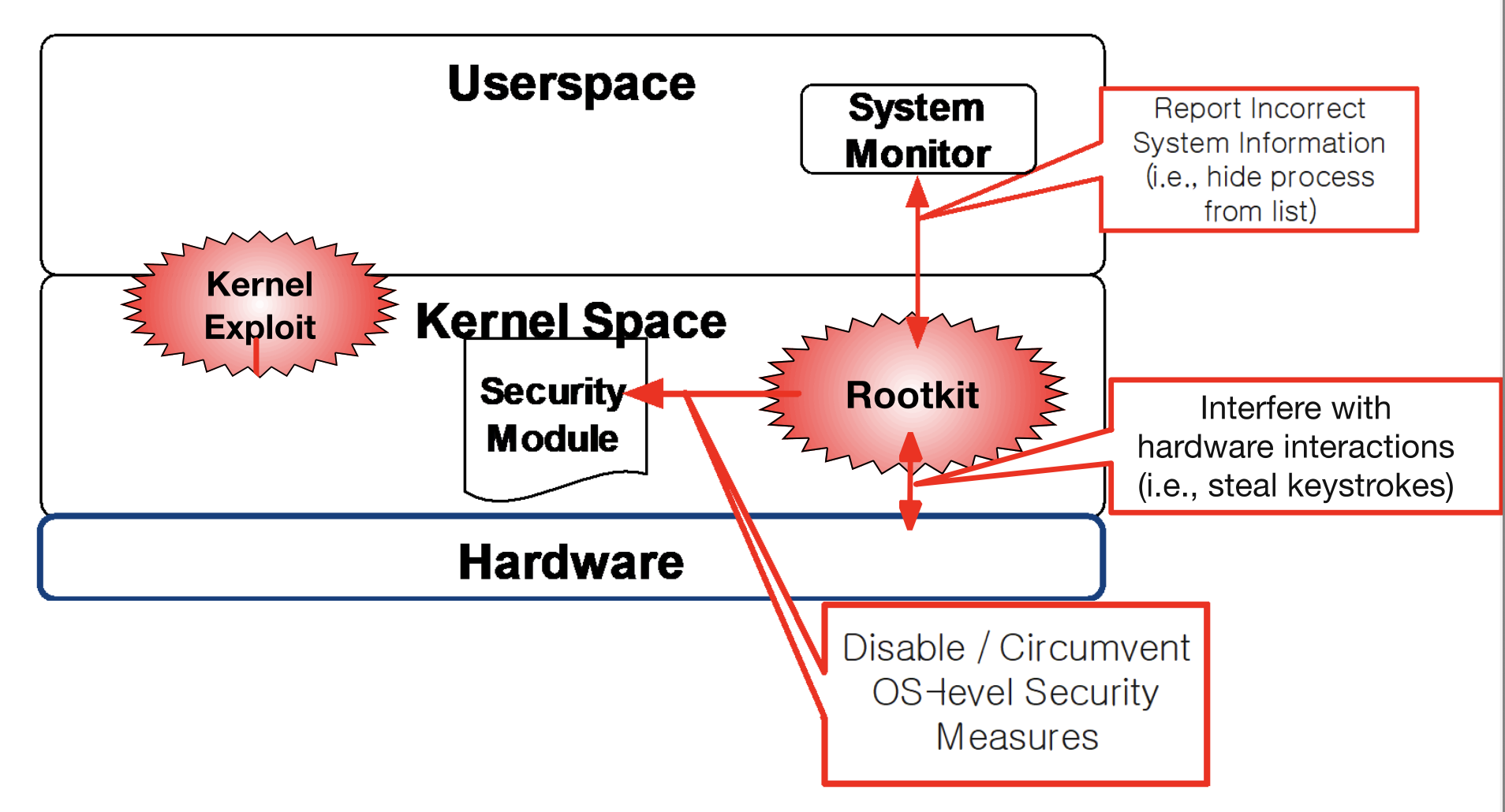 하드웨어와의 상호작용에 직접 개입해서 키보드 입력을 가로챌 수도 있고.. System Monitor를 속여서 악성 프로세스 목록을 숨길 수 있다.