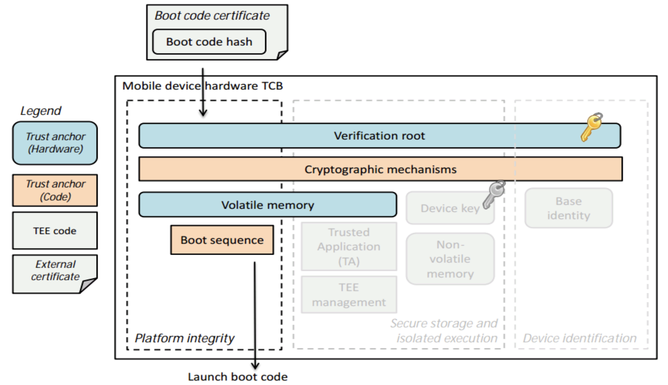 Verification Root가 Base Identity를 관리하고 장치의 신원을 증명한다.