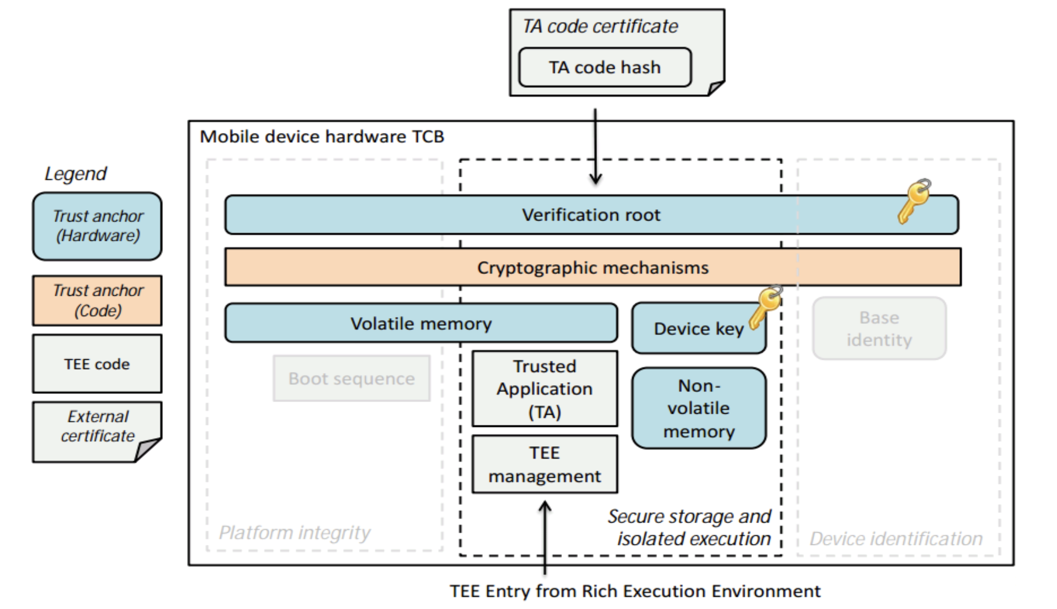 TEE 내부에는 안전하게 저장된 Device Key가 있고 이 Key를 기반으로 Device Public Key가 생성된다.