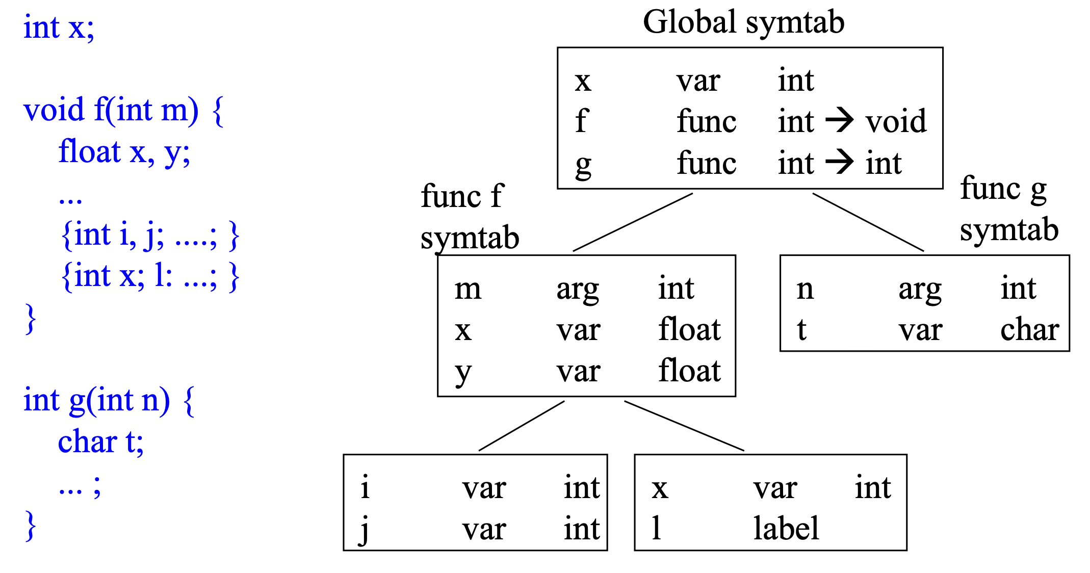 각각의 Lexical Scope마다 Symbol Table이 생성되고, 자신의 블록에 없는 변수는 상위 블록에서 찾아서 사용할 수 있다.