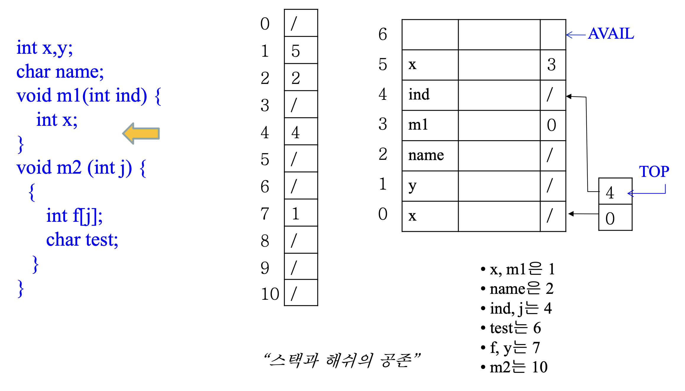 Top은 스택 Top을 가리키는 포인터이고, AVAIL은 현재 Scope의 시작점을 가리킨다.