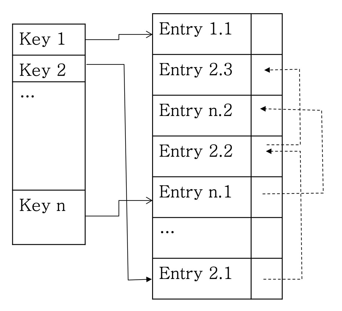 Hash 를 사용하니 Collision이 발생할 수 있음. Chaining 으로 연결하는 일반적인 해시 테이블임.
