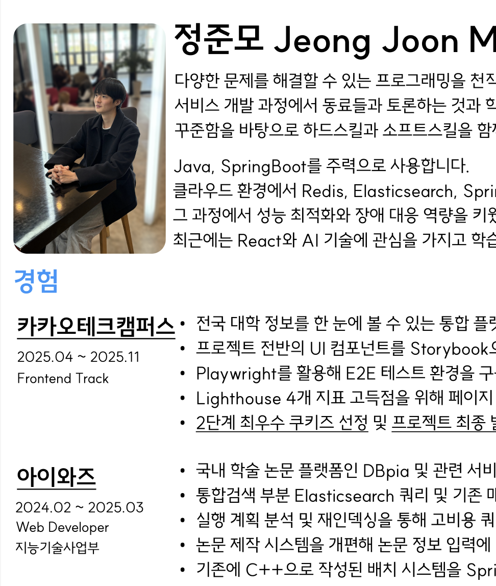 또, 포트폴리오에는 내가 했던 모든 작업을 기록하고, 이력서에는 핵심만 뽑아서 한 페이지 ~ 두 페이지 내외로 작성하려고 함.