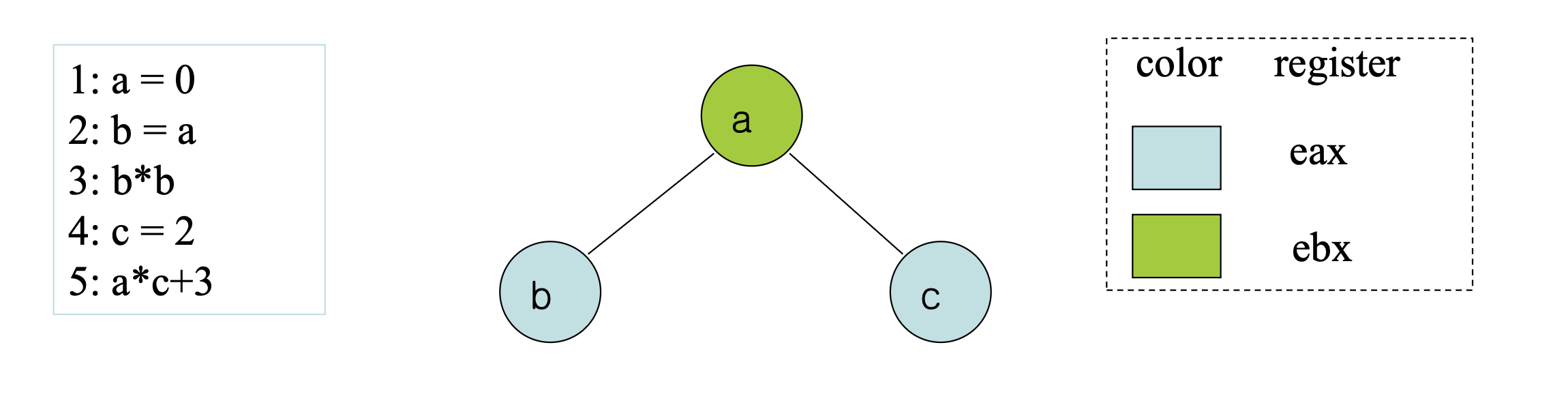 4-5 구간에서 a와 c가 동시에 살아있으니 둘은 간섭한다. 그러니 서로 다른 레지스터랑 사용해야 함.