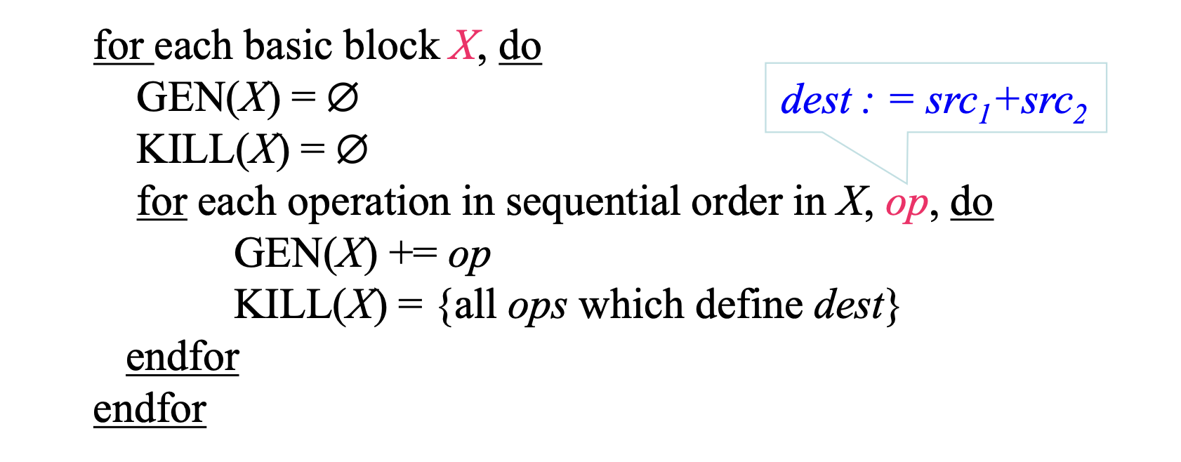 KILL : Basic Block 때문에 죽어버린 프로그램 전체의 다른 정의들을 의미함.