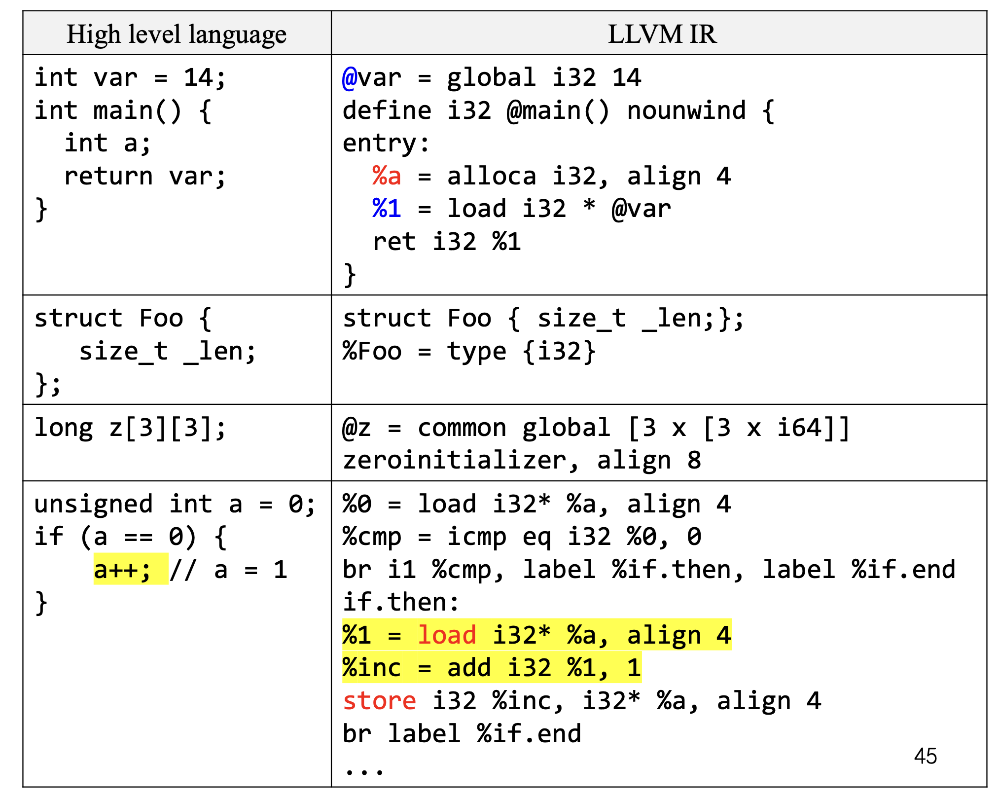 LLVM IR 코드를 보면 %1 처럼 뒤에 번호나 이름이 붙은 임시변수들이 계속 새로 생기는데, 이게 SSA라는 증거임.