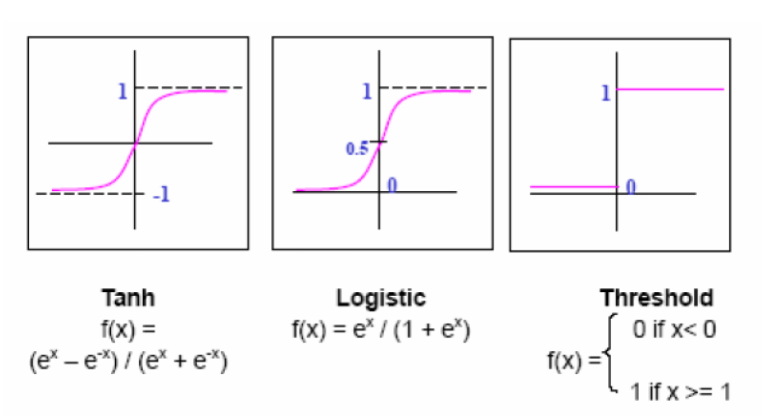 이진 분류를 사용할 때는 Threshold, 0~1 사이의 확률로 변환할 때는 Logistic 등.. 상황에 따라 적합한 활성 함수를 씀.