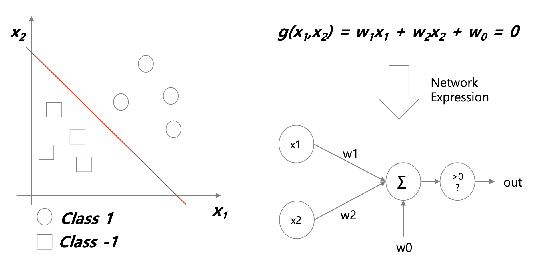 기하 관점에서는 그래프그리는거고, 대수 관점은 g(x) > 0 이면 Class 1, g(x) < 0 이면 Class -1 이런식..