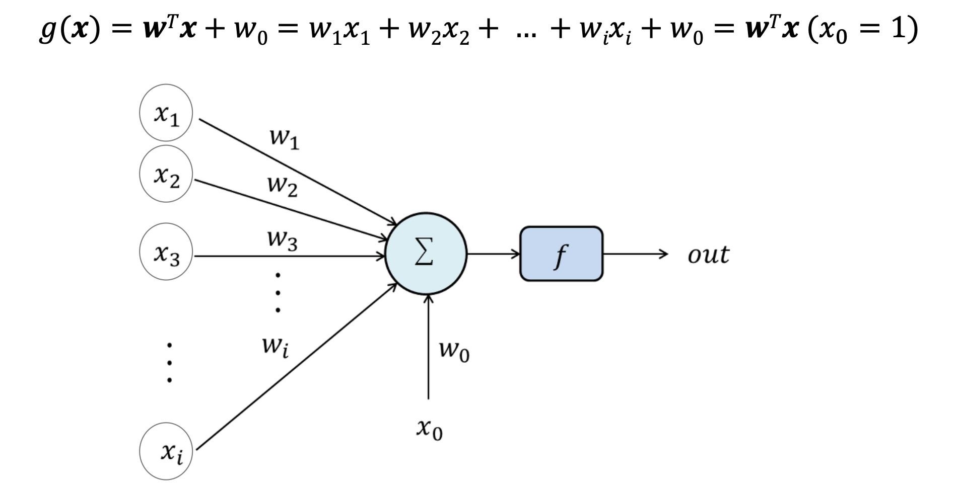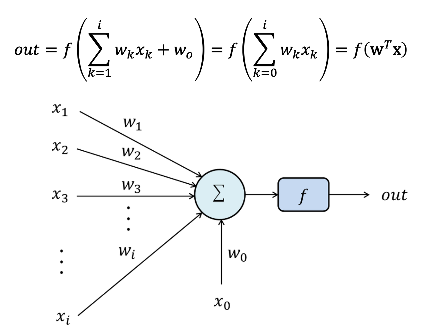 각 입력은 w0, w1.. 가중치들과 곱해진다. (Bias)