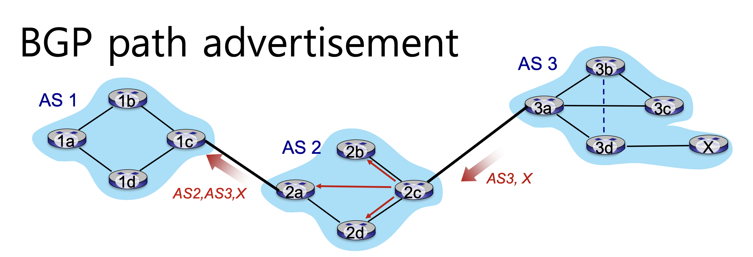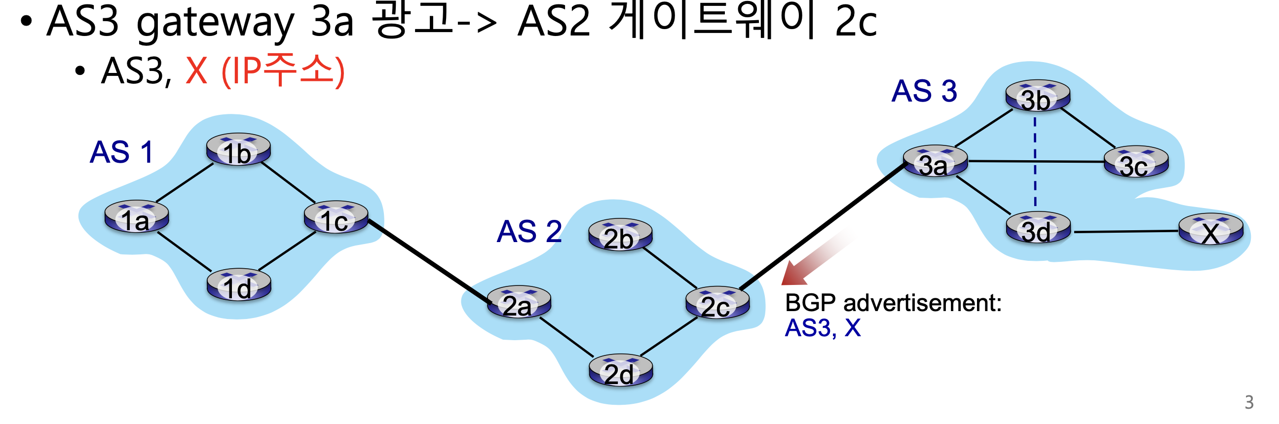 3a 라우터는 2c에게 정보를 보낸다. - 네트워크 X로 가고 싶으면 AS 3로 와야 함~