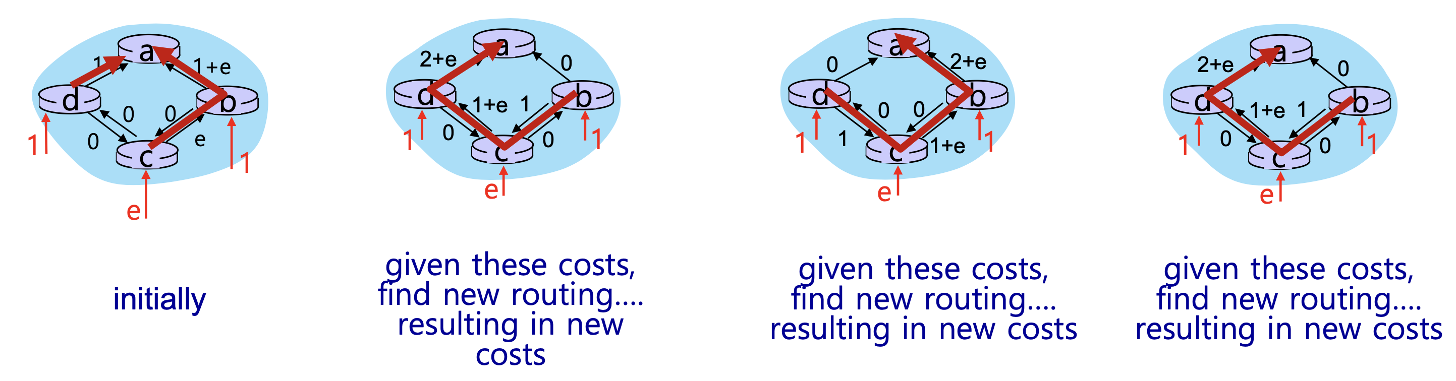 Link State Algorithm은 트래픽 양을 비용으로 설정할 때 Oscillation 문제가 발생한다.
