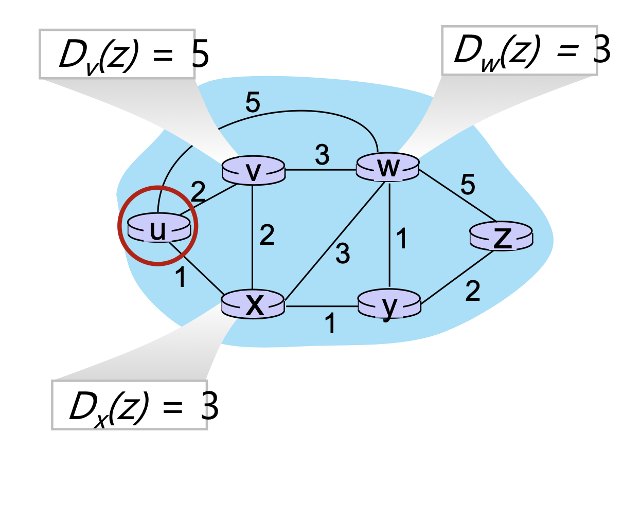 옆에 있는 노드에게 목적지로 갈 때의 비용을 물어보고 가장 작은 값을 선택한다.