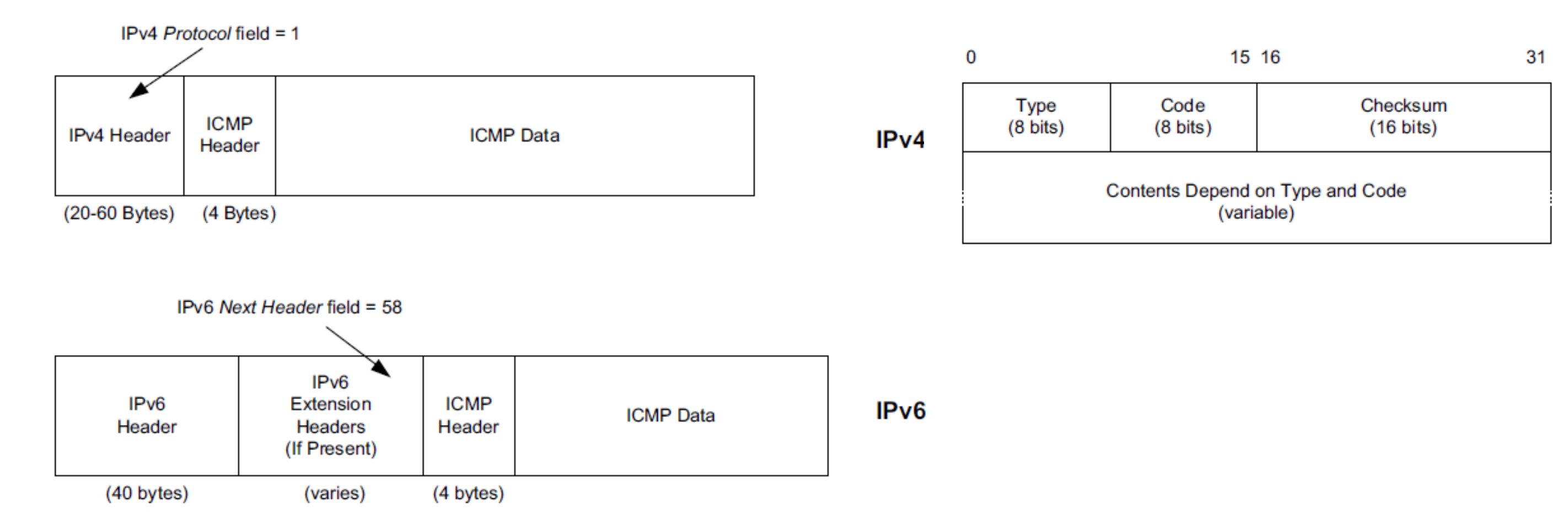 ICMPv4 체크섬은 ICMP 데이터 영역만을 커버하고, ICMPv6 체크섬은 IP 헤더의 일부 필드를 포함한다.