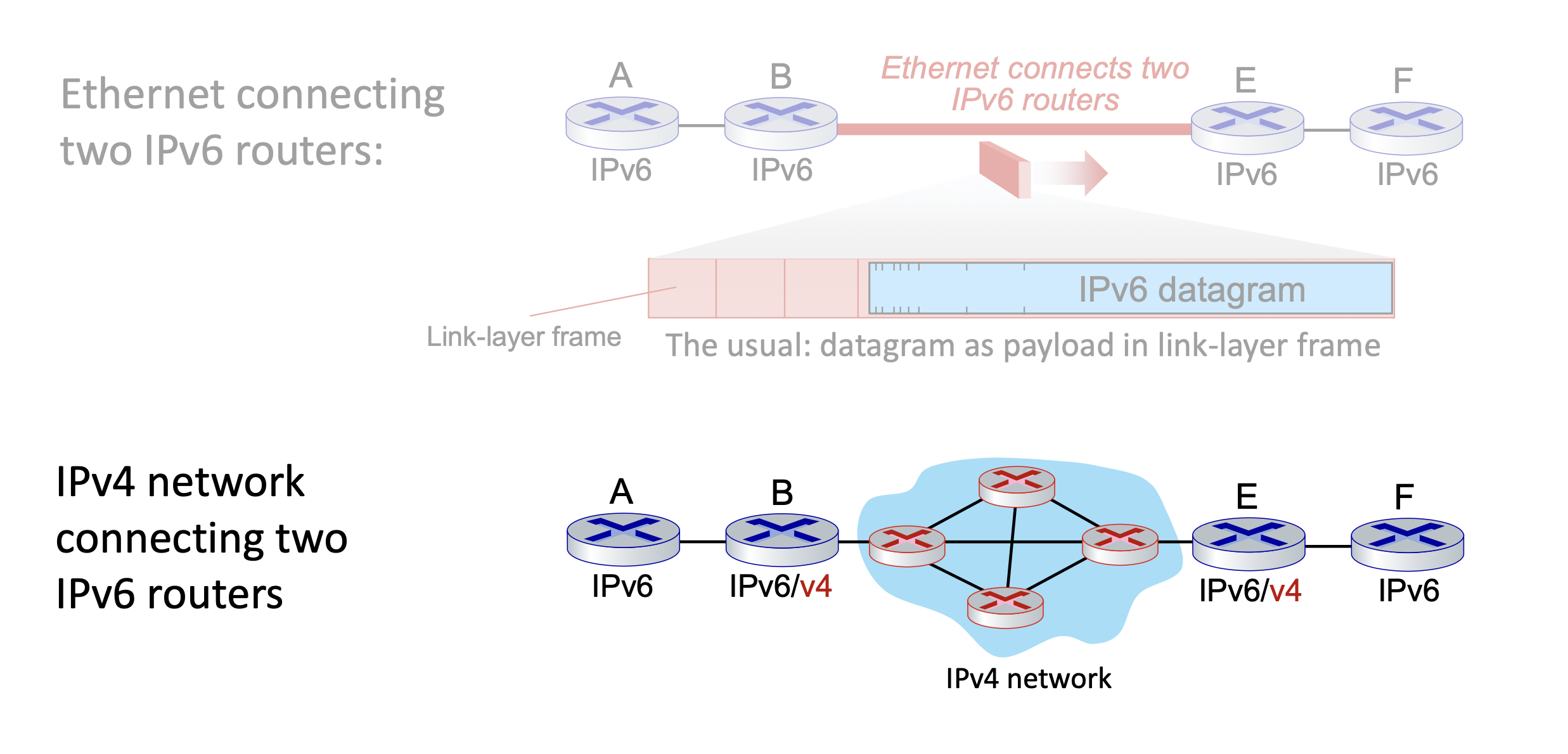 B -> E : B는 IPv6 데이터그램을 그대로 IPv4 데이터그램의 Payload에 집어넣고, 겉에 IPv4 헤더를 붙인다.
