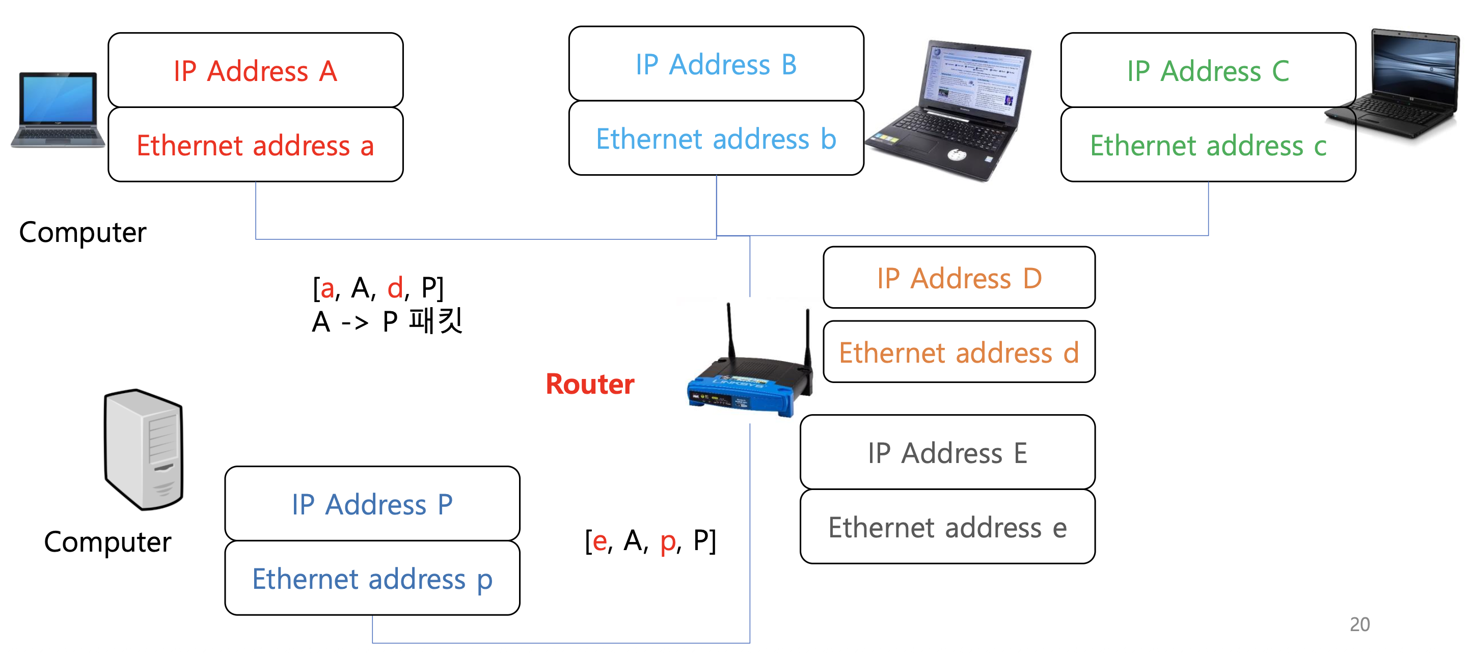 여러 네트워크를 연결해 줘야 하니 라우터는 연결된 네트워크 수 만큼 IP 주소를 가진다.