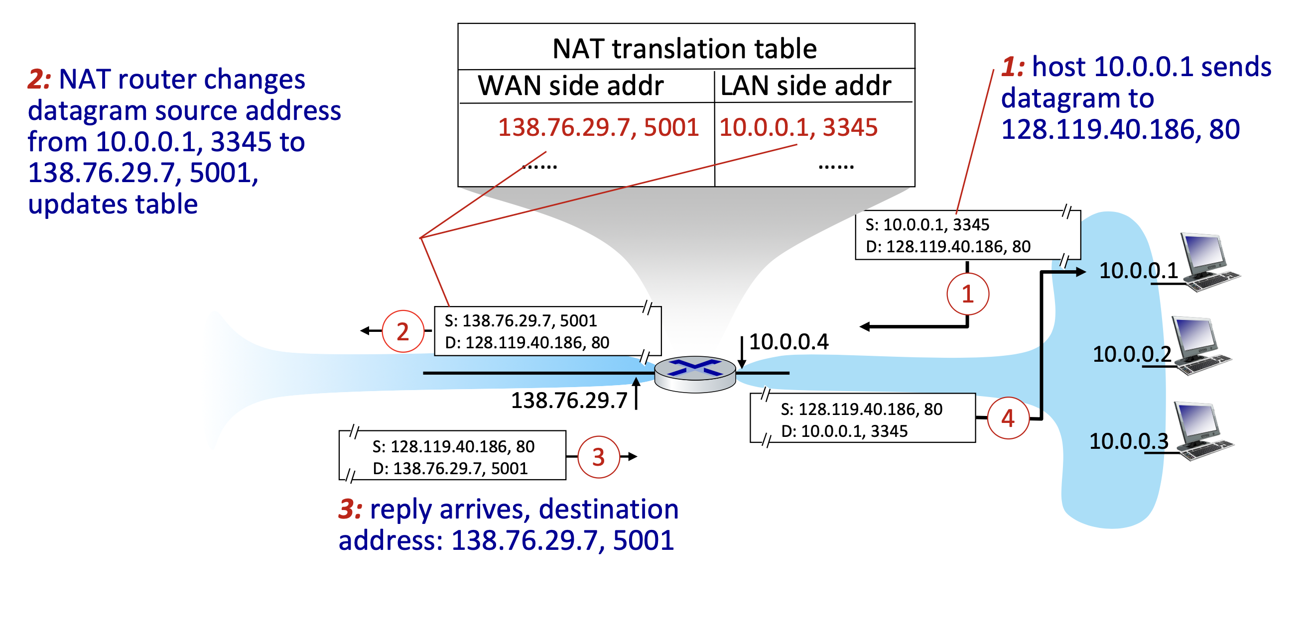 이 때 Translation Table에 이 정보를 기록함. (138.76.7:5001 -> 10.0.0.1:3345)