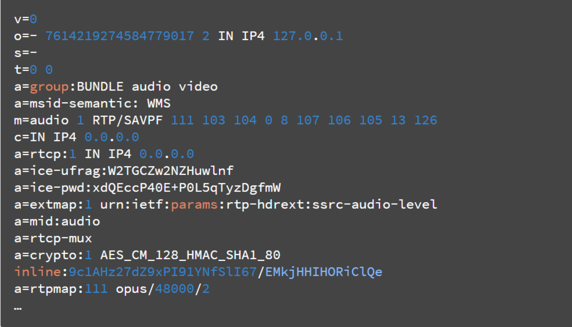m=audio 1 RTP/SAVPF 111 ... -오디오를 보내고, RTP/SAVPF 프로토콜을 쓰고, 1번 포트를 사용함을 알려줌.