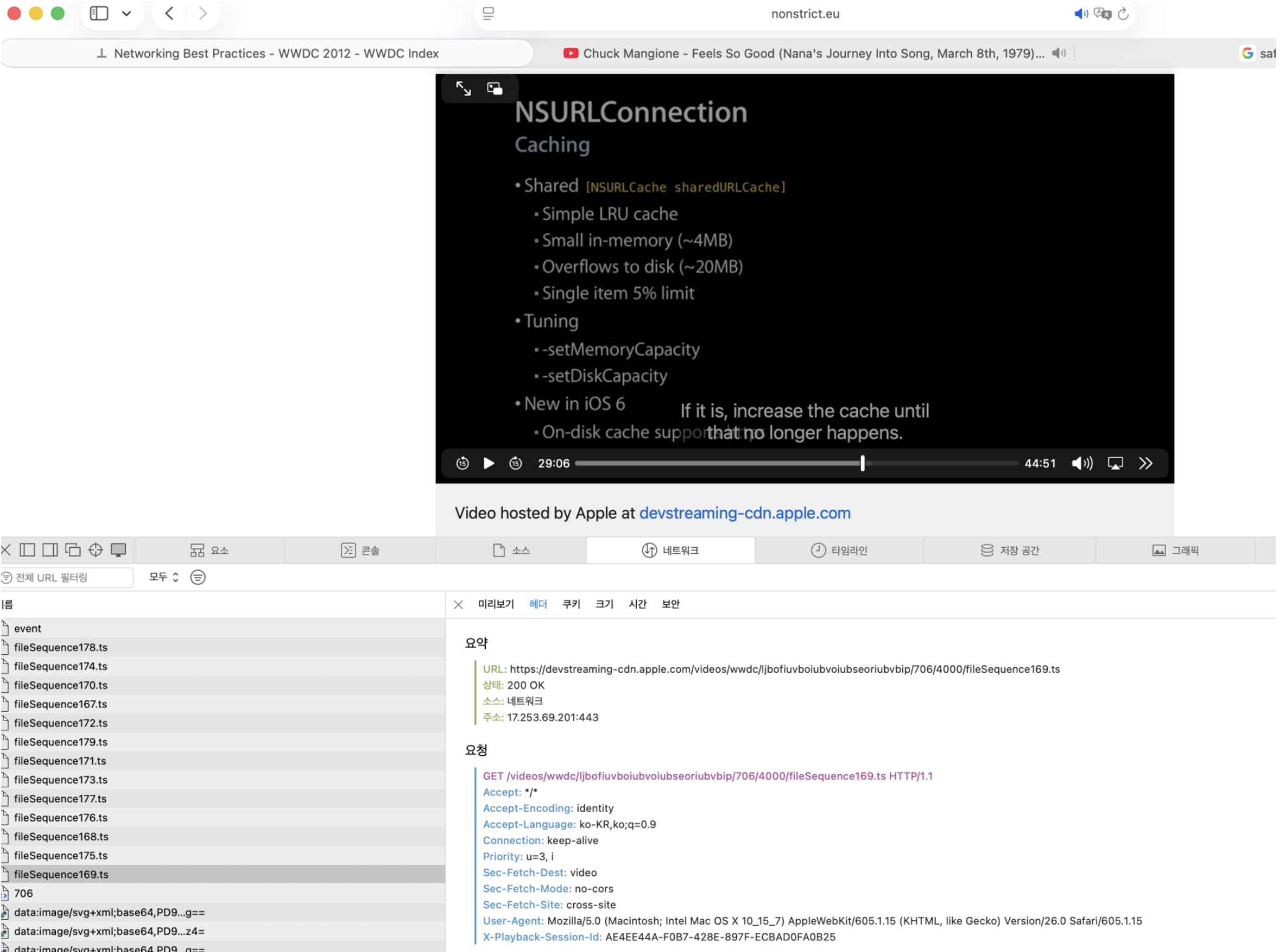 애플의 CDN 서버로부터 영상을 받아올 때 찍히는 로그. 유튜브랑은 좀 다르다.