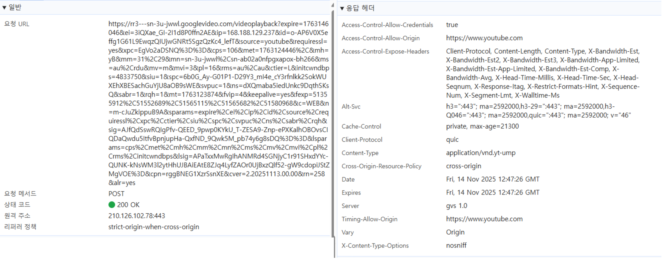 유튜브에서 네트워크 탭 켜고 확인해보면 구글 전용 CDN인 googlevideo.com 을 사용함을 확인할 수 있음.
