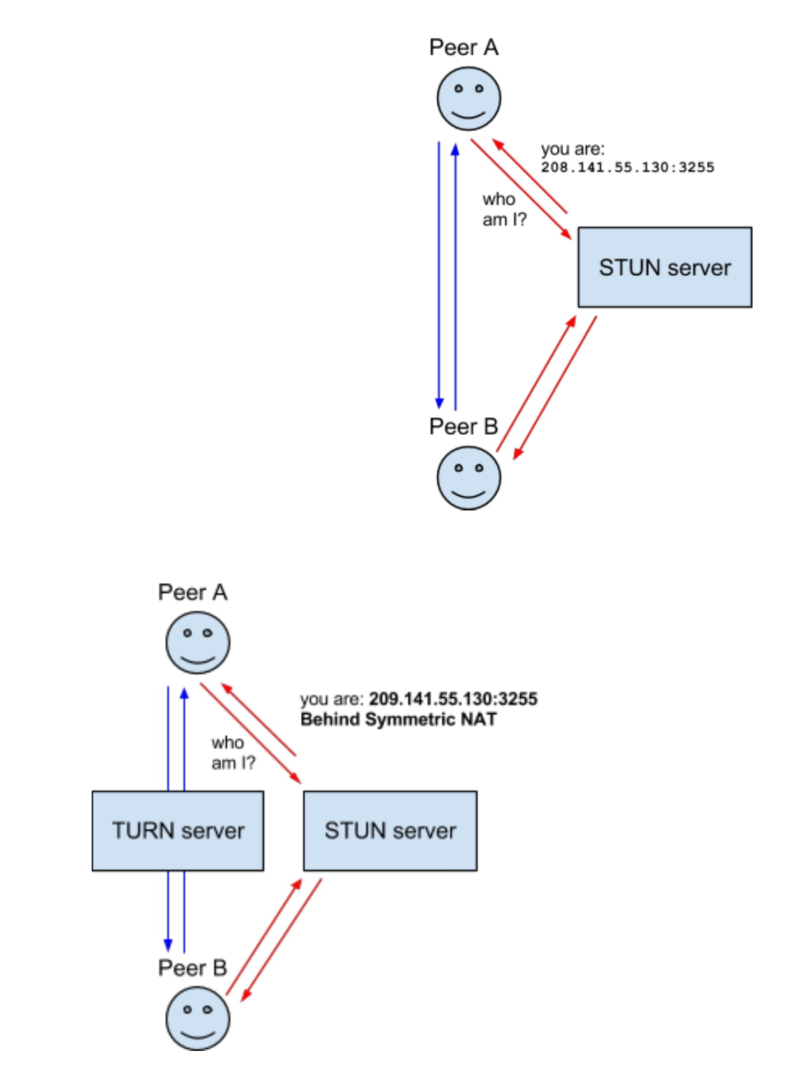 STUN - 공인 IP 주소와 포트 번호가 뭔지 물어보는 서버.