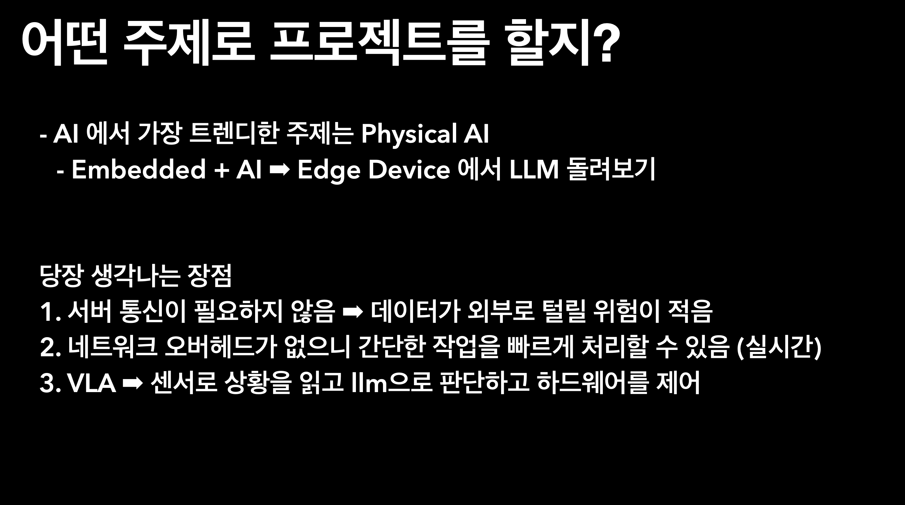 TinyML으로도 충분히 좋은 주제를 설정할 수 있지만, 최신 트렌드인 llm을 엮으면 좀 더 좋은 주제가 나오지 않을까 싶네요.