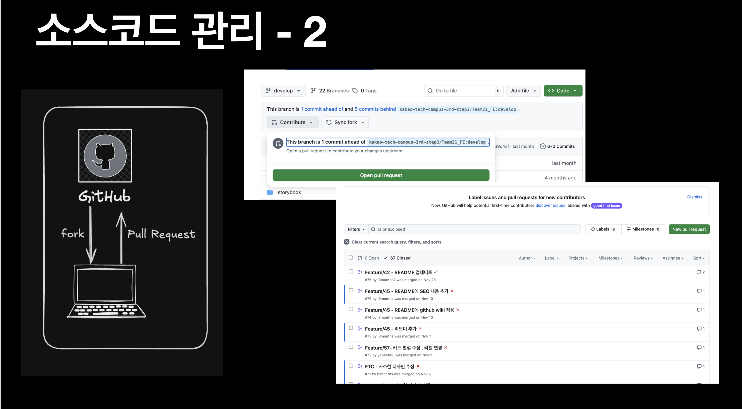 이전 캡쳐에서 확인할 수 있듯, PR 단위로 프로젝트의 개발 이력이 남게 되어 이력 추적에 도움이 됩니다.