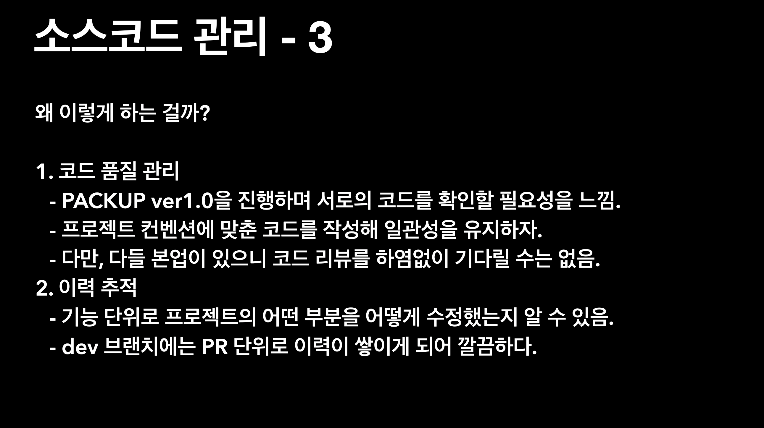 다만, 다들 본업이 있으니 급하다면 다른 사람이 자신의 PR을 리뷰해 줄 때 까지 기다리지 말고, 본인이 직접 병합하고 작업을 이어가도록 합시다.