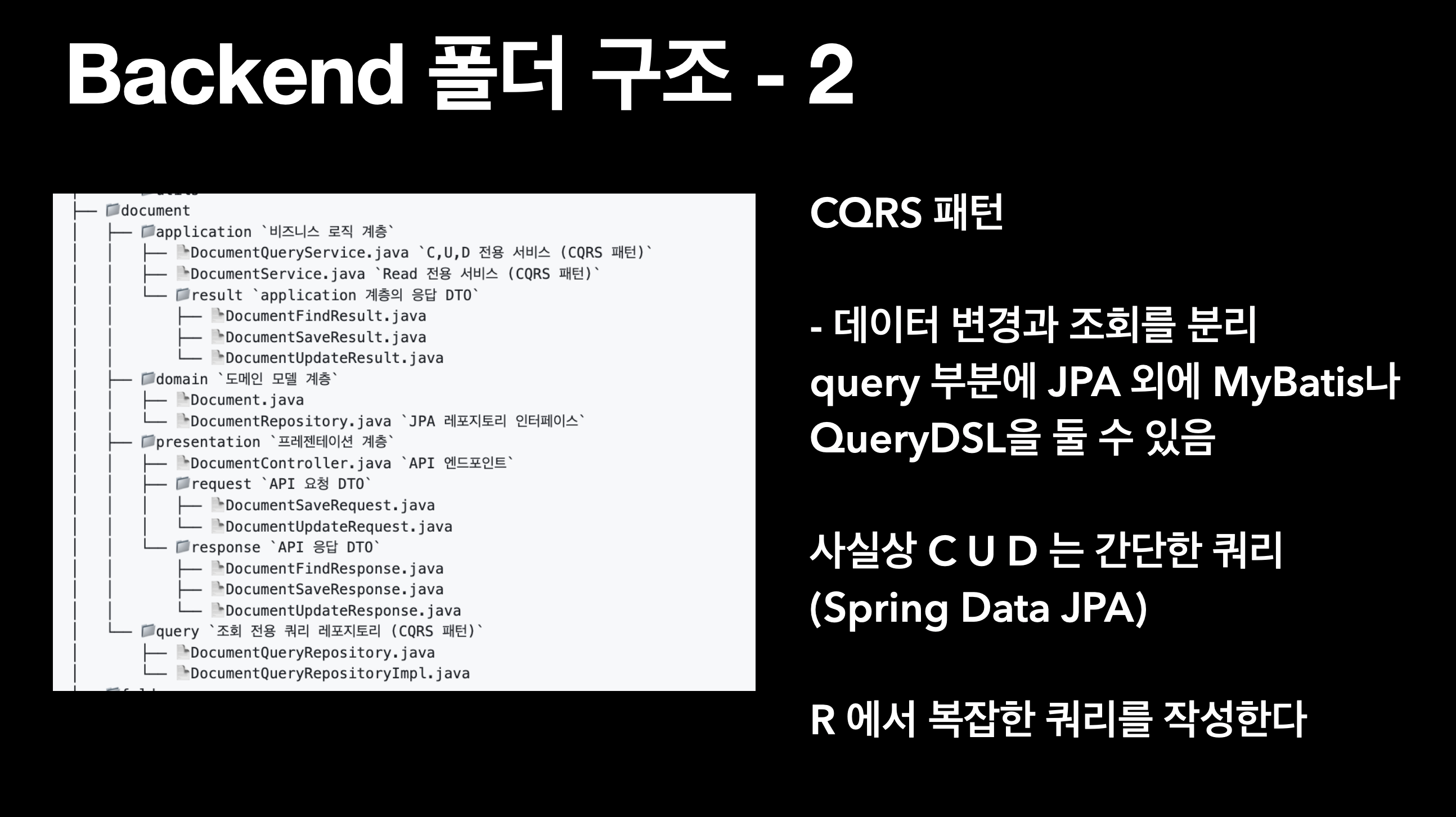 그러니 Service와 Repository를 분리하고, 복잡한 Read 쿼리를 따로 분리해서 MyBatis나 QueryDSL을 깔끔하게 분리합니다.