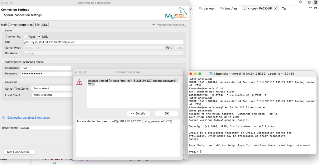 일단 터미널 CLI에서는 잘 붙으니까 DB나 계정문제는 아니다.