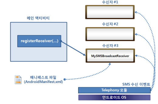 브로드캐스트 수신자는 인텐트 필터를 통해서 원하는 메세지만 받게 만들 수 있고, 매니페스트 파일에 등록함으로써 인텐트를 받을 준비를 한다.