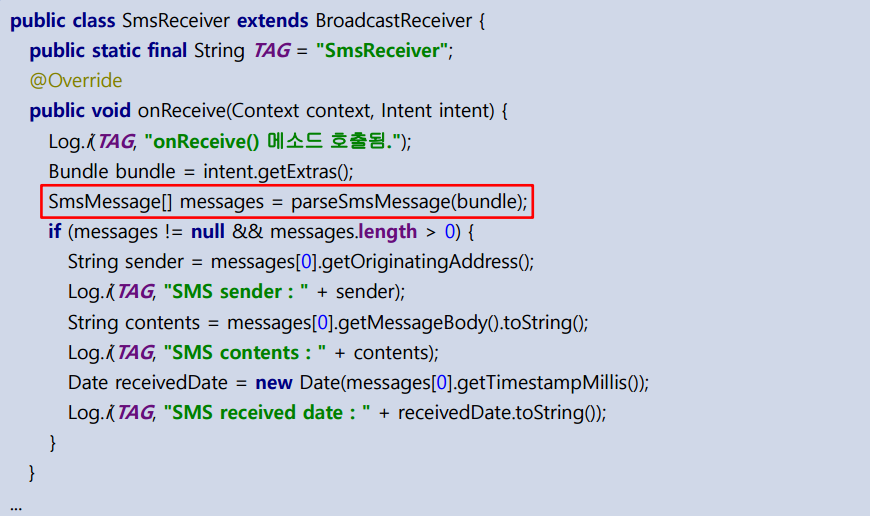 메세지인 인텐트를 Bundle 타입으로 받아오고, 문자메세지가 여러 개일 수 있으니 배열로 메세지를 처리한다.