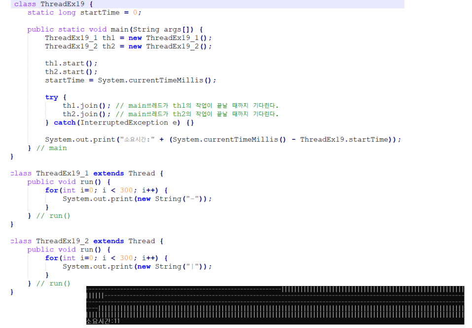 메인 쓰레드가 쓰레드1과 쓰레드2가 끝날 때 까지 기다린 다음 메인 쓰레드가 실행하는데에 걸린 시간을 출력한다.