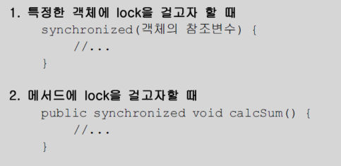 한 번에 하나의 쓰레드만 객체에 접근할 수 있도록 객체에 lock을 설정해 객체를 보호한다.