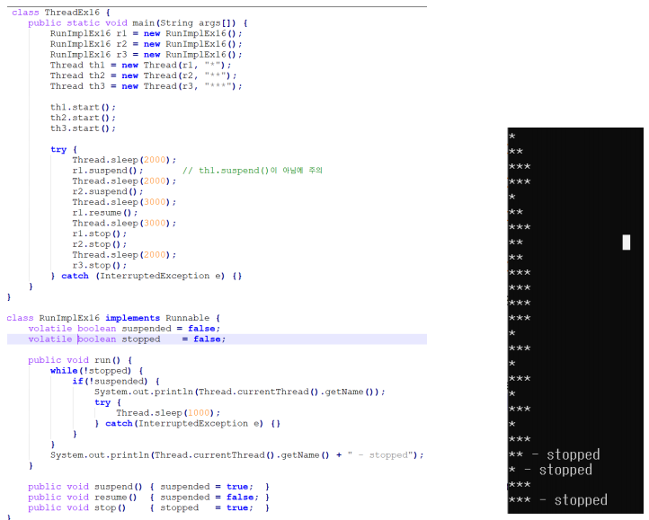 이 메서드들 중에서 stop suspend resume 메서드는 호환성을 위해서 정의돼있긴 하지만, 쓰레드의 비정상적인 종료에 큰 영향을 미치는 메서드들이기 때문에 자바에서 사용을 권장하지 않는다.