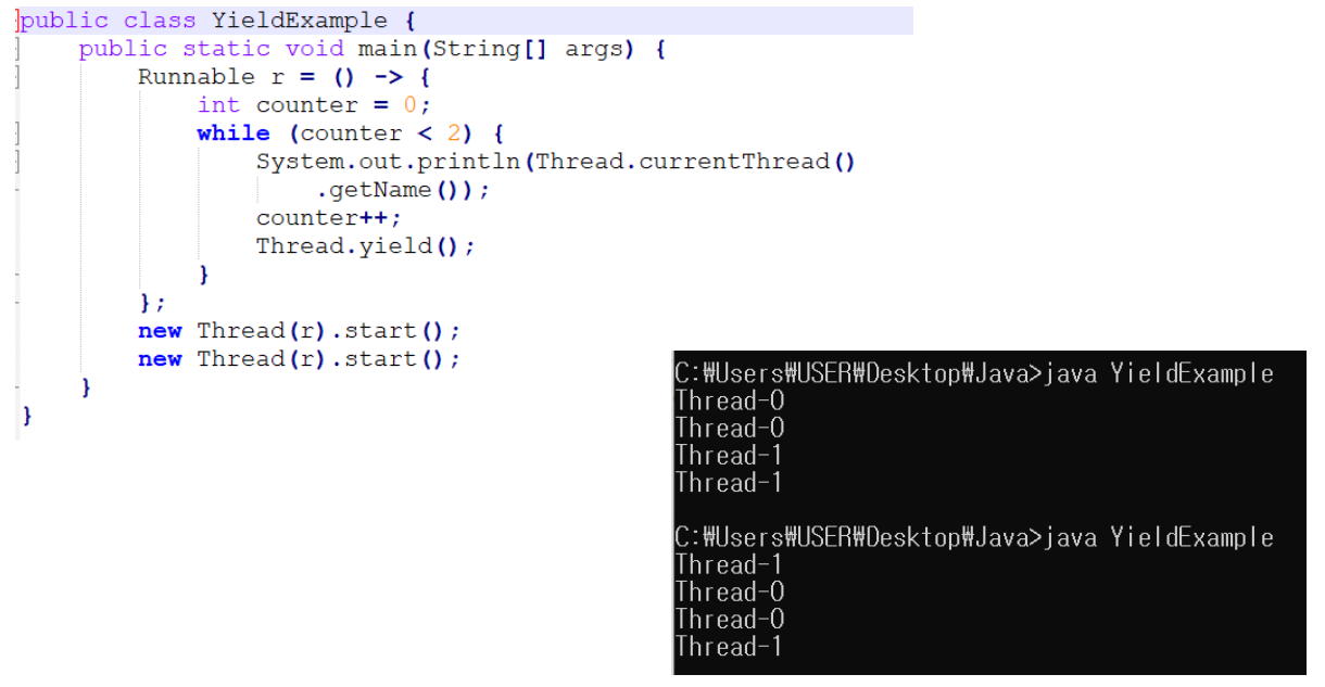 위의 과정은 정상적으로 쓰레드가 실행되는 과정인데, 만약 실행되는 과정에서 실행대기 과정으로 옮기고 싶으면 yield메서드를 사용할 수 있고, 실행 도중 강제로 종료하고 싶으면 stop 메서드를 사용할 수 있다. (권장되지 않는 함수지만)