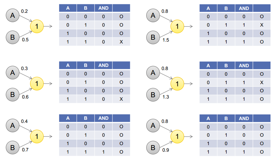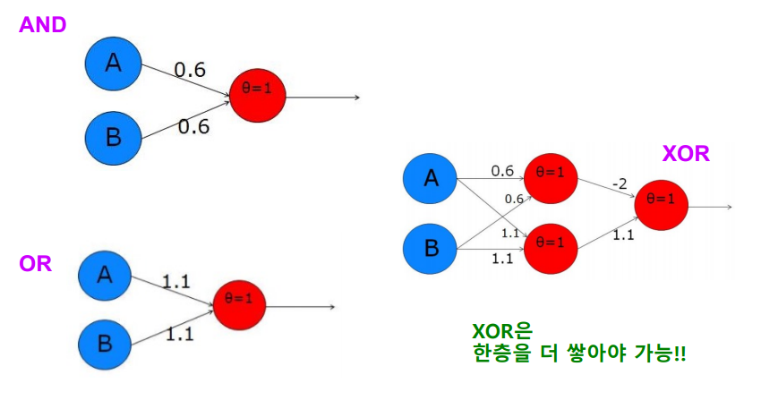 퍼셉트론에서 w값을 튜닝해 AND와 OR는 구현할 수 있다. (OR 증명은 생략)